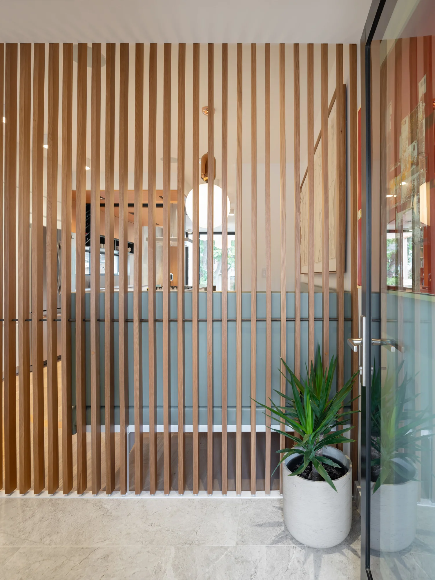 Upon entering the front door, a wood slat screen redirects the flow of movement into the home, and offers glimpses in to the dining room beyond.