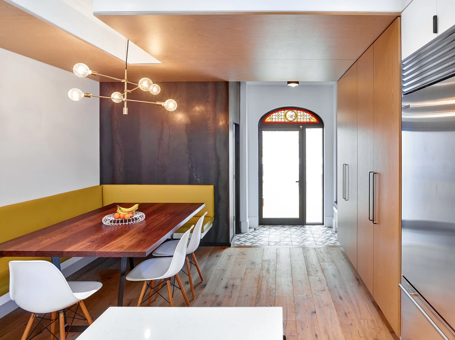 Stepping up from the entryway, the ground floor opens onto a cozy built-in banquette with a wood ceiling that wraps down one wall, defining a warm space for gathering and enjoying meals together.